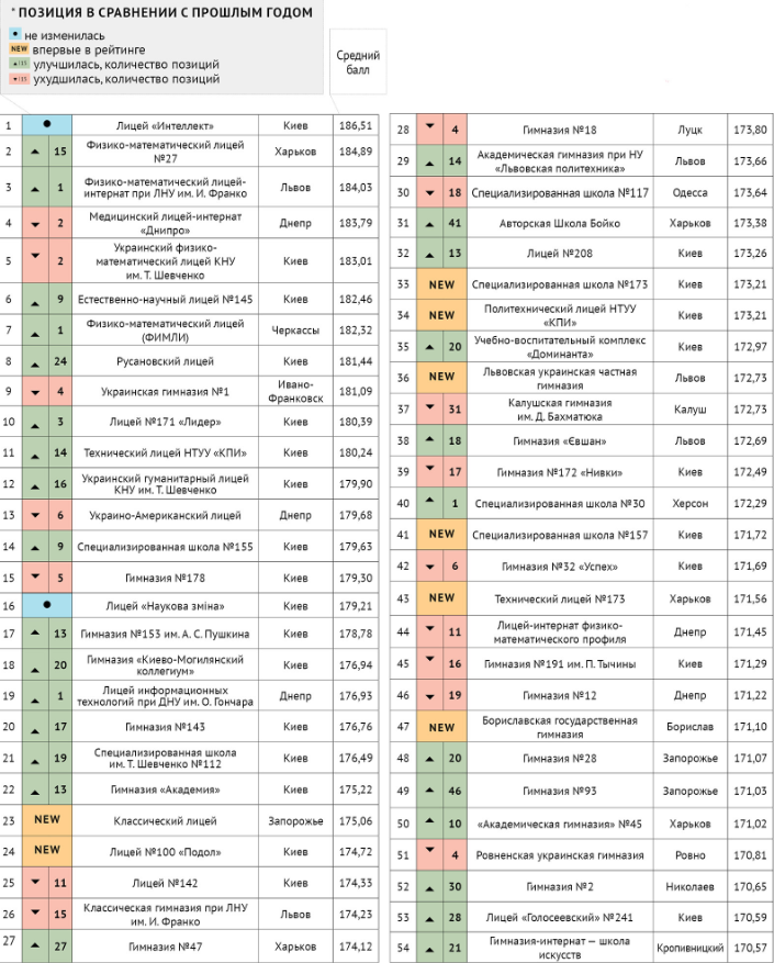 В этом году рейтинг обновился на 32%. Среди лидеров — школы не только городов-миллионников, но и небольших населённых пунктов. Несколько учебных заведений прибавили сразу 200–300 пунктов. Абсолютный рекордсмен — гимназия им. О. Партицкого из города Жидачов Львовской области. Выпускники гимназии продемонстрировали колоссальный рост среди номинантов: они поднялись на 831 позицию (с 925-го на 94-е место). Самое большое падение — на 54 пункта — зафиксировано в лицее «Малая академия наук» в Белой Церкви, однако его воспитанники по-прежнему удерживают школу в сотне лучших. Лидером третий год подряд остаётся киевский лицей «Интеллект», опередив ближайших конкурентов на два балла.