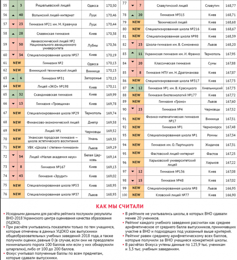 Журнал «Фокус» в шестой раз составил рейтинг «100 лучших школ Украины». Третий год подряд данные основываются на результатах внешнего независимого оценивания (ВНО).