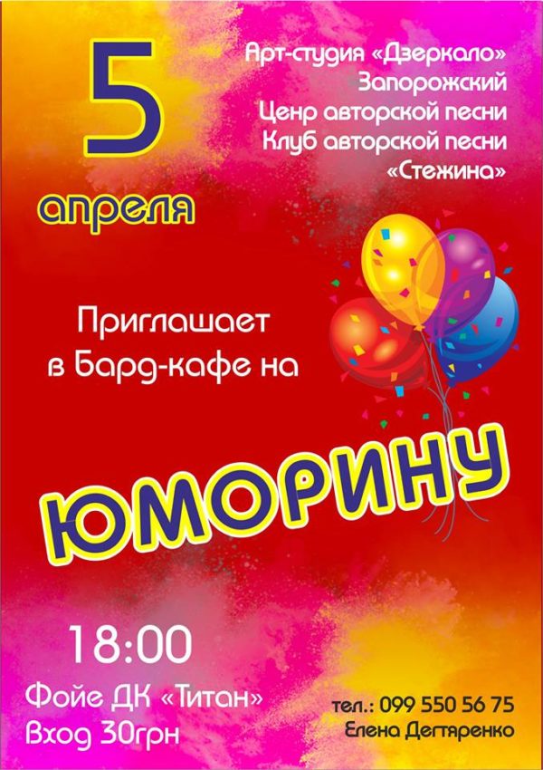 Запорожцев приглашают посетить увлекательное и очень весёлое мероприятие, которое пройдет 5 апреля в ДК «Титан». Лучшие барды и комики представят свои номера в программе. Так же, для тех, кто обладает отличным чувством юмора состоится конкурс анекдотов.