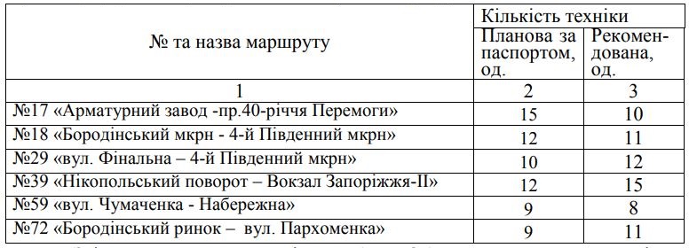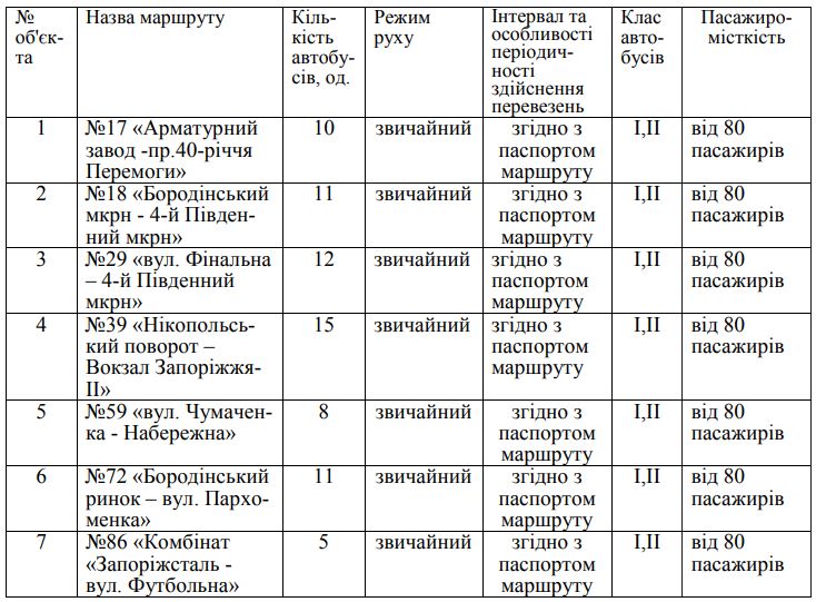 Кроме того, исполнительный комитет Запорожского горсовета утвердил количество и класс автобусов, режимы движения на маршрутах общего пользования №17, 18, 29, 39, 59 и 72.Решение основывалось на результатах обследования, анализе пассажиропотоков на маршрутах городского авто- и электротранспорта, изменении в маршрутной сети общественного транспорта города.