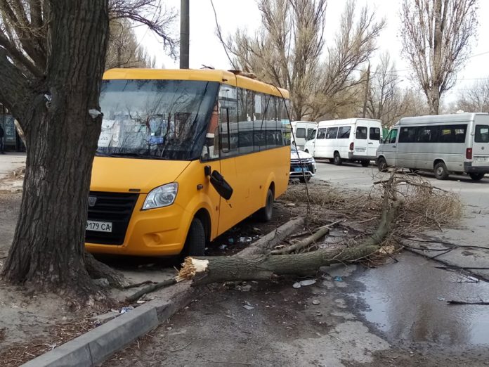 Инцидент произошел сегодня, 27 марта, в Шевченковском районе Запорожья. Так, на конечной остановке общественного транспорта на маршрутное такси №53 рухнула огромная ветка, которая откололась от аварийного дерева.