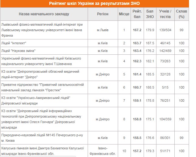 На днях информационно-образовательный ресурс «Освита.ua» опубликовал рейтинг общеобразовательных школ Украины по итогам сдачи ВНО 2017.