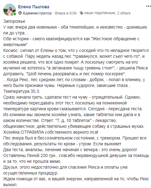 Зоозащитница Елена Пылова опубликовала в социальной сети шокирующий пост, в котором рассказала о судьбе собаки по кличке Рекс. Пес средних лет пару недель назад отравился и практически слег. Хозяйка животного решила отравить Рекса, «чтоб печень разорвалась и чтоб не мучился». Женщина заявила соседке, что «эвтаназия стоит 1000 гривен» и безжалостно подсыпала собаке в миску с едой отраву.
