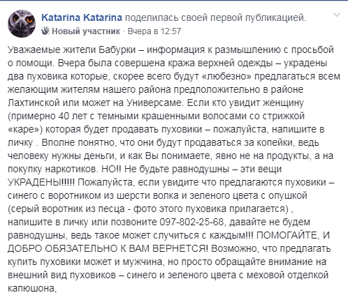 На днях, из помещения, расположенного по улице Энтузиастов, что в Хортицком районе Запорожья были похищены два пуховика. Пострадавшие просят горожан быть внимательными и бдительными, а также связаться с ними, если вам вдруг предложат на улице приобрести «по дешёвке» женские пуховики с опушкой.