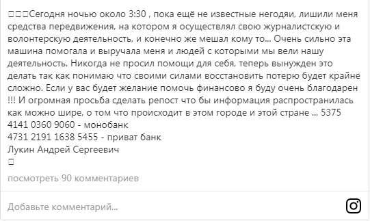 Как оказалось, автомобиль принадлежал известному в Запорожье активисту и волонтеру Андрею Лукину. О произошедшем мужчина сообщил на своей странице в социальной сети. По словам Андрея, неизвестные злоумышленники целенаправленно лишили его средства передвижения, так как им «мешала» его расследовательская деятельность. На данный момент Андрей собирает деньги на новый автомобиль и просит откликнуться всех неравнодушных.
