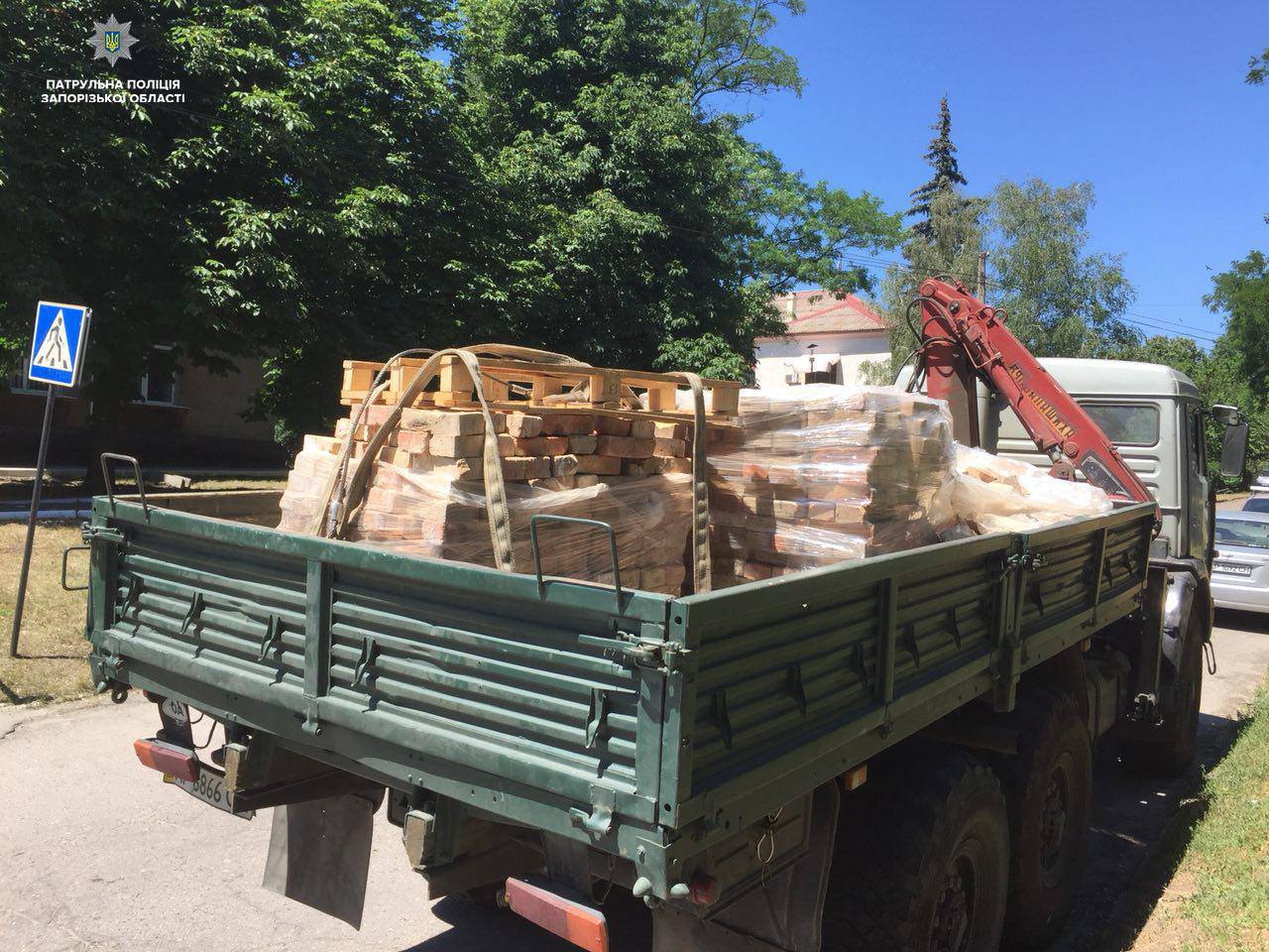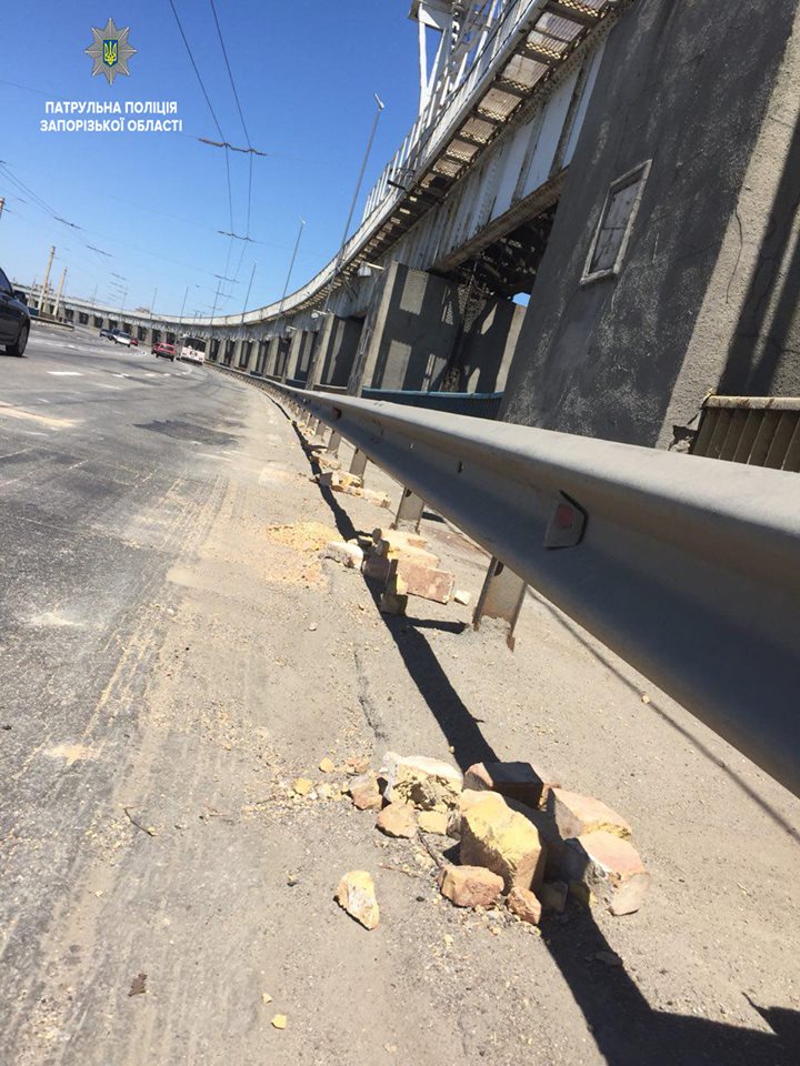 Как сообщают в пресс-службе патрульной полиции, инцидент произошёл в районе плотины ДнепроГЭСа. Тут сотрудники полиции остановили грузовик, загруженный под завязку. Сообщается, что кузов грузовика был забит кирпичами, которые попросту выпадали прямо на проезжую часть на плотине.
