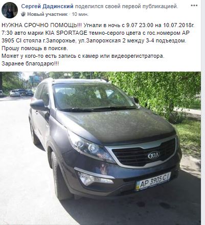 В социальной сети местный житель опубликовал запись о том, что ещё 10 июля со двора дома по ул. Запорожской угнали его автомобиль. «Пропал» автомобиль марки KIA Sportage. В записи мужчина сообщил, что авто угнали ночью. Владелец машины надеется, что кто-то может обладать какой-либо информацией о происшествии, а момент угона даже мог зафиксировать чей-то регистратор или камера наблюдения.