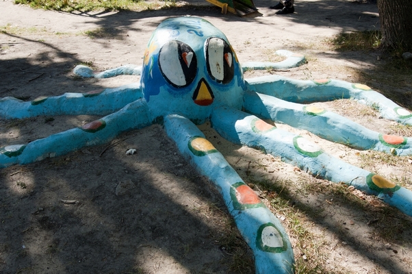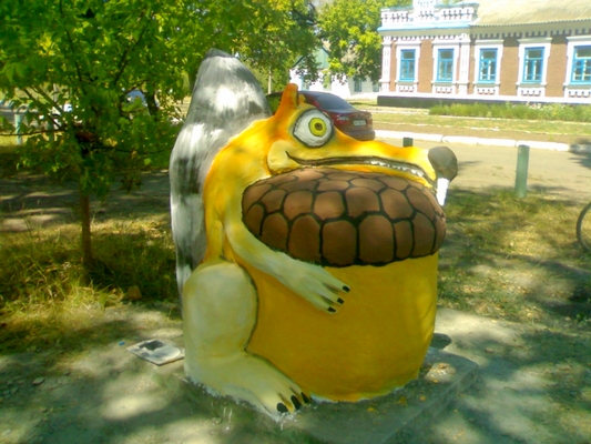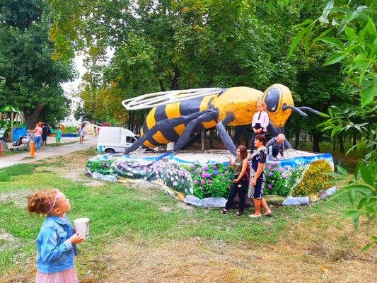 Семиметровую пчелу-гиганта сделал скульптор-любитель Александр Артеменко. К слову, пчела не единственная скульптура в поселке. Ранее в Веселом появились лев, осьминог, верблюд, ящерица и Скрат (герой мультфильмов «Ледниковый период»).