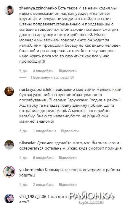 «Есть такое. И за нами ходил. Мы идем с колясками, он нас как увидит, и начинает крутиться, и никуда не уходит. То отойдет и стоит, штаны поправляет. Страшно, и продавщицы из магазина говорили, что он заходит в магазин, смотрит долго на девушку, а затем идет за ней. Мы не молчали, мы звонили, говорили, что он ходит за нами. С ним проводили беседу, но, как видно человек болен, и говорить с ним без толку. Видимо, надо ждать, пока что-то случится, как всегда у нас происходит».
